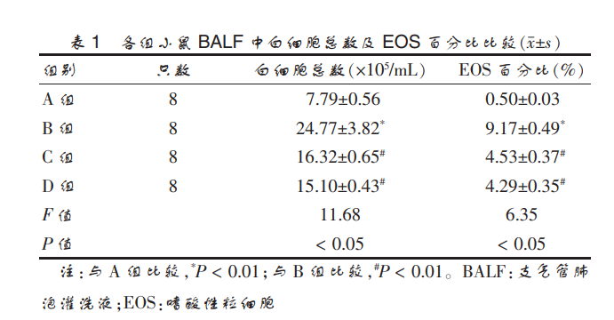 A 組小鼠氣道黏膜無增厚,氣道周圍無炎癥細胞 浸潤,肺泡壁結構完整;B 組小鼠氣道黏膜充血水腫, 氣道周圍較多炎癥細胞浸潤,肺泡結構被破壞;C 組 小鼠氣道周圍少量炎癥細胞浸潤,管壁無明顯增厚; D 組小鼠程度與 C 組小鼠相似。 見圖 1(封四)。2.3 各組小鼠 BALF 中白細胞總數(shù)和 EOS 百分比的 比較 與 A 組比 較,B 組小 鼠 BALF 中白 細 胞 總 數(shù) 和 EOS 百分比均顯著升高,差異有高度統(tǒng)計學意義(P < 0.01)。 與 B 組比較,C 組和 D 組小鼠 BALF 中白細胞 總數(shù)及 EOS 百分比明顯降低,差異有高度統(tǒng)計學意 義(P < 0.01)。C、D 兩組白細胞總數(shù)和 EOS 百分比比較, 差異無統(tǒng)計學意義(P > 0.05)。 見表 1。