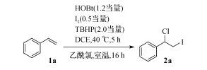 首先筆者采用苯乙烯1a的1-氯-2-碘代反應為 模板反應,對反應條件進行優化。苯乙烯與1.2當 量1-羥基苯并三氮唑、0.5當量碘單質,以2當量質 量分數為70%的 TBHP為氧化劑,在二氯乙烷溶劑 中40 ℃下反應5h,隨后與5當量乙酰氯進一步室 溫反應16h,能以45%的收率得到目標產物2a。苯 乙烯1a的1-氯-2-碘代反應過程為在此基礎上篩選氧化劑、溶劑和氯化 試 劑。氧 化劑對反應收率的影響如表1中 序 號1~5所 示。 在沒有氧化劑的情況下,烯烴的1-氯-2-碘代反應不 能進行。對常見的氧化劑進行篩選,發現過硫酸鉀 和二叔丁基過氧化物對反應沒有作用,雙氧水作氧 化劑目 標 產 物 的 收 率 達 到 29%。因 此,最 終 選 擇 TBHP水溶 液 作 氧 化 劑。