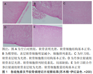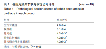實驗選用新西蘭白兔50只,分為 5組,實驗過程無脫失,全部進入結果分析。空白對照組膝關節軟骨無明顯 磨損, 周圍滑膜無明顯增生及炎性改變。模型組液組膝關 節磨損較為嚴重,軟骨破壞達到3級,但并未暴露軟骨下骨, 周圍滑膜增生及炎性改變較為明顯。針刀組、丹參注射液 組、針刀聯合丹參注射液組膝關節輕度磨損,1級到2級, 周圍滑膜增生及炎性改變不明顯,兩組在大體觀下無法辨 別磨損嚴重程度的差異。空白對照組 軟骨表明光滑、軟骨細胞梭形排列,形態、數目、結構基 本正常,無血管翳生成;模型組表層軟骨細胞明顯減少, 細胞排列紊亂;針刀組軟骨表層較為光滑、軟骨細胞數目 結構基本正常;丹參注射液組軟骨表層光滑、軟骨細胞排 列輕度紊亂,局部缺損;針刀聯合丹參注射液組軟骨表層 較為光滑,軟骨細胞數量結構基本正常。見圖1。病理切片 評分,丹參注射液組評分略高于針刀組和針刀聯合丹參注 射液組,但此3組之間差異無顯著性意義。見表1。