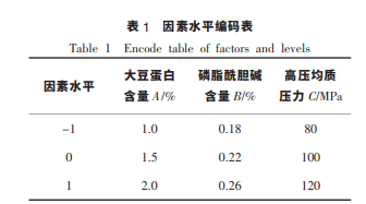 乳化制備工藝響應面優(yōu)化 以大豆蛋白-磷脂酰 膽堿納米乳液的平均粒徑、PDI 及乳化產(chǎn)率為考 察指標,通過單因素試驗考察大豆蛋白含量、磷脂 酰膽堿含量、 高壓均質壓力及均質次數(shù)對 3 個指 標的影響規(guī)律。 進一步利用 Design-Expert 軟件對 試驗進行響應面分析設計優(yōu)化試驗結果, 選取大 豆蛋白含量 A(%)、磷脂酰膽堿含量 B(%)、高壓 均質壓力 C(MPa)及均質次數(shù) D(次)4 個因素為 自變量, 以粒徑 R1 (nm)、PDI R2 及乳化產(chǎn)率 R3 (%)為響應值,設置三因素三水平進行試驗,如表 1 所示。