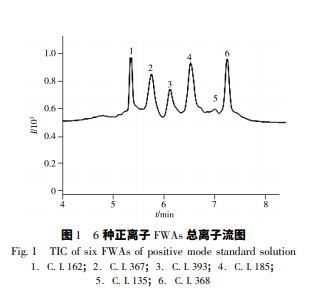 6460 三重四極桿液質(zhì)聯(lián)用儀( 美國安捷倫公司) ; 5810R 冷凍離心機(jī)( 德國艾本德股份公司) ; R - 12 平行溶劑濃縮蒸發(fā)儀( 瑞士步琦有限公司) ; VORTEX KB - 3 渦旋振蕩器( 中國海門其林貝爾儀器制 造有限公司) ,MS105DU 電子天平( 美國梅特勒公司) 。 10 種熒光增白劑標(biāo)準(zhǔn)品: C. I. 393( 純度≥99. 7% ) 、C. I. 135( 純度≥99. 8% ) 、C. I. 185( 純度≥ 98. 1% ) 、C. I. 367( 純度≥99. 9% ) 、C. I. 162( 純度≥95% ) 、C. I. 368( 純度≥97. 9% ) 購于上海安譜公 司; C. I. 71( 146 μg /mL) 、C. I. 113( 108 μg /mL) 、C. I. 353( 103 μg /mL) 、C. I. 220( 101 μg /mL) 為購于 福州綠川生物科技有限公司的混合對(duì)照品。甲醇、乙腈( 色譜純,Merck 公司) ,PSA、C18 ( Welch 公 司) 。