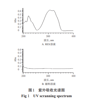 取干燥至恒質(zhì)量的 RES 對照品適量,置于量瓶中,加 1%醋酸 10 mL,超聲(功 率:180 W,頻率:59 kHz,時間:2 min,下同)溶解,并用 無水乙醇稀釋成質(zhì)量濃度為5 μg/mL的溶液,同法配制 相應(yīng)濃度的輔料溶液,采用紫外分光光度法,在 200~ 400 nm 波長范圍內(nèi)進(jìn)行紫外掃描。結(jié)果顯示,RES 在 307 nm波長處有最大吸收,輔料對其測定無干擾,故選 擇307 nm 波長作為 RES 的含量測定波長,紫外光譜圖 見圖1。