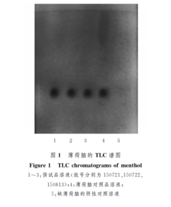 取復(fù)方薄荷酚酸酊(批號 150721、150722、150813)適量 作 為 供 試 品 溶 液。取 薄荷腦對照品加甲醇制成濃度為10mg/ml的對照 品溶液。按照制劑處方制備不含薄荷腦的復(fù)方薄荷 酚酸酊陰性 樣 品,取陰性樣品適量作為陰性對照。 按2015年版藥典四部 TLC 實驗 操 作 方 法,吸取 上述3種溶液各2μl,分別點于同一硅膠 G 薄層板 上,以甲苯-乙酸乙酯(V∶V=19∶1)為展開 劑,展 開,取出,晾干,噴以5%香草醛濃硫酸-乙醇(1∶4) 的混合溶液,在105 ℃加熱至斑點顯色清晰。在供 試品色譜中,與對照品色譜相應(yīng)的位置上,顯相同顏 色的斑點,陰性對照色譜無相應(yīng)斑點,見圖1。 2.2 乙醇含量測定 ?。保岔椣拢保皞€批次的復(fù)方 薄荷酚酸酊,各精密量?。玻担恚欤茫保担啊玻埃埃恚煺?餾瓶中,加水約50ml。按照2015年版藥典四部通則 0711乙醇量測定法第二法蒸餾法,測定樣品中乙 醇的含量,每批次平行測定2份。結(jié)果顯示,樣品中 乙醇的含量為44%~50%,平均 值 為47%,擬定復(fù)方薄荷酚酸酊中乙醇的量在42%~52%。
