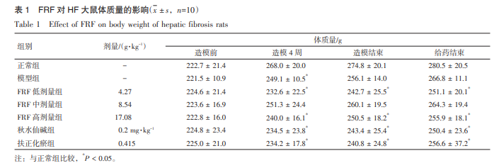 結果見表 1。實 驗造模前各組大鼠體質量比較,差異無統計學意義 (P>0.05)。造模 4 周時,各造模組體質量均低于正 常組,除 FRF 中劑量組外,差異均有統計學意義 (P <0.05);各造模組間比較,差異無統計學意義 (P>0.05)。造模 8 周結束時,各造模組體質量仍低 于正常組,除模型組、FRF 中劑量組外,差異均有 統計學意義(P < 0.05);各造模組間比較,差異無統 計學意義(P>0.05)。藥物干預 4 周結束時,各藥物 干預組體質量仍低于正常組,除模型組、FRF 中劑 量組外,差異均有統計學意義(P < 0.05);但與模型 組比較,各給藥組的體質量差異無統計學意義(P> 0.05)。提示 HF 造模能影響大鼠體質量,但陽性藥 及 FRF 的干預作用不明顯。正常組比較,模型組的 ALT、AST、γ-GGT、TBIL 含量顯著增高(P < 0.05,P < 0.01),ALB 含量顯著 降低(P < 0.01)。與模型組比較,FRF 各劑量組的 ALT、AST、TBIL 均顯著下降(P < 0.05,P < 0.01), ALB 含量顯著升高(P < 0.05,P < 0.01),FRF 中、 高劑量組的 γ-GGT 顯著下降(P < 0.05,P < 0.01)。Masson 切片顯示正常組僅于匯管區有少量藍染的膠原纖維分布,無明顯膠原增生。與正常組 比較,模型組大鼠的門管區藍染纖維組織增多,中 央靜脈壁增厚,多數大鼠藍染的纖維組織自門管區 或中央靜脈向外延伸,少數大鼠有纖維隔形成,呈 藍染;HF 程度分級經非參數檢驗,與正常組比較差 異有統計學意義(P<0.01)。與模型組比較,給藥組 大鼠的肝纖維組織增生程度均有不同程度的減輕, 膠原纖維減少、變細;肝纖維化程度分級,除 FRF 低劑量組外,差異均有統計學意義(P<0.01)。