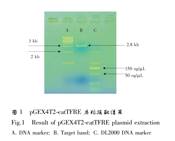 pGEX4T2-catTFRE 的提取 catTFRE 序列根據高等脊椎動物轉錄因子庫設計 ( http: / /jaspar.genereg.net /) ,將其鏈接到 pGEX4T2 載體上,得到全長為 2.8 kb 的重組質粒。將 1 μL pGEX4T2-catTFRE 質粒加入到 50 μL TOP10 感受態細胞中,經熱激、復蘇后涂布于氨芐抗性 LuriaBertani 平板,37℃ 培養過夜,取單菌落接種于 2 mL Luria-Bertani 培養液,培養 6 h,按 1 ∶ 100 接種至 50 mL 培養基,培養 18 h,按試劑盒說明提取質粒。