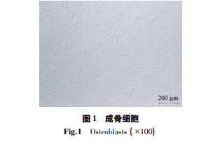 無菌條件下取出出生 72 h 的 SD 乳鼠頭骨,置 入 4°C 的 PBS 溶液中,然后應用眼科鑷與手術刀剔 除表面的結締組織,用 4°C 的 PBS 溶液反復吹打清 洗組織并將其剪成小于 1 mm3 的組織塊,將剪好的 組織塊轉移到 1. 5 mL 離心管中,加 3 倍體積的胰 酶,將離心管置入 37 ℃ 的脫色搖床(TS-1000型)中進行消化,振 蕩消化 20 min 后加入胎牛血清終止消化,放置于 4 ℃ 冰 箱 中 靜 置 5 min,舍 棄 上 清 液,加 入 0. 2% Collagenase I,置于 37 ℃的脫色搖床中,消化并振蕩 60 min 后用胎牛血清終止消化,多次吹打后通過 200 目濾網過濾去除碎片,收集濾液,1 200 r /min 離心 8 min,棄上清液,用 DMEM 完全培養基進行重 新懸浮細胞,置于 37 ℃,5% CO2 培養箱中進行培 養; 2 d 后換液,之后間隔 2 ~ 3 d 換 1 次培養液。并在倒置顯微鏡下觀察細胞形態及生長情況,取培養 的第三代成骨細胞進行后續實驗。