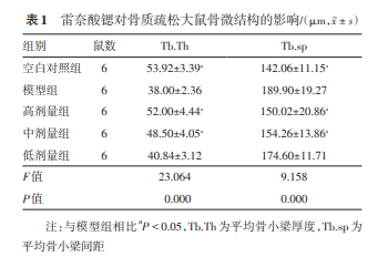HE 染色結果提示, 地塞米松模型組大鼠骨小梁變細、數量明顯減少, 排列疏松,甚至斷裂,骨小梁結構出現較多大的空 白區域;雷奈酸鍶中、高劑量組(600,800 mg/kg)骨小梁變粗且致密,骨連續性較好,排列較為規則(圖1)。 MOTIC Med 6.0型圖像系統分析,較模型組,雷奈酸 鍶中、高劑量組的平均骨小梁厚度明顯升高(P< 0.05),骨小梁間距明顯降低(P<0.05)。見表1。